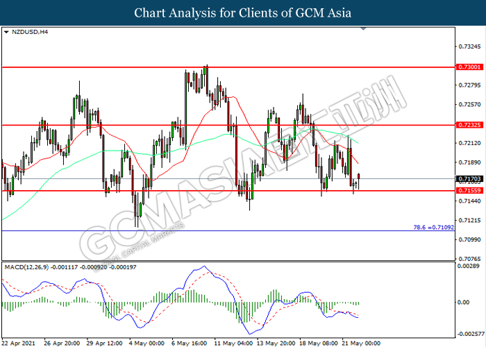 NZDUSD, H4: NZDUSD was traded lower while currently testing the support level at 0.7155. MACD which illustrated increasing bearish momentum suggest the pair to extend its losses after it successfully breakout below the support level.