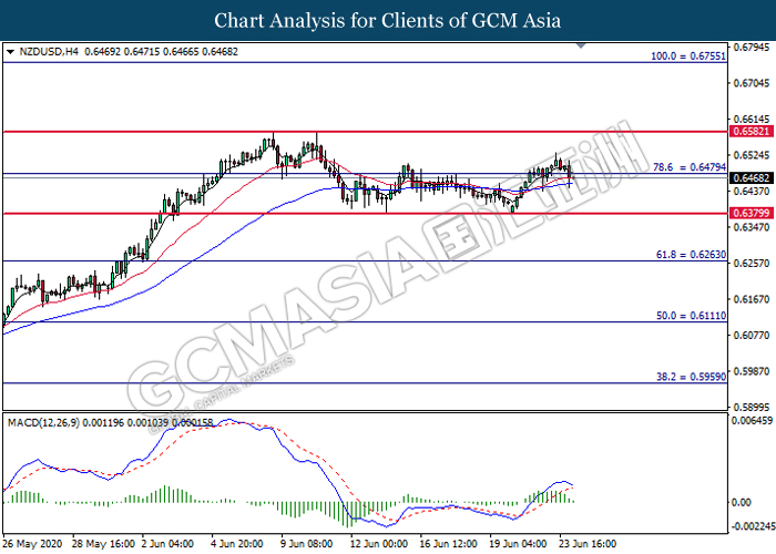 NZDUSD, H4: NZDUSD was traded lower following prior breakout below the previous support level at 0.6480. MACD which illustrate diminishing bullish momentum signal suggest the pair to extend its losses toward the support level at 0.6380.