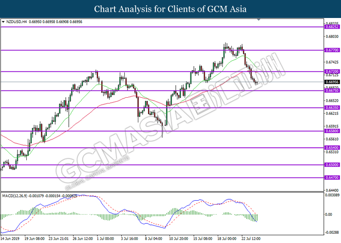 NZDUSD, H4: NZDUSD was traded lower following prior breakout below previous support level 0.6720. However, MACD which display diminishing bearish momentum suggest the pair to rebound back towards the resistance level 0.6720 as a short-term technical correction.