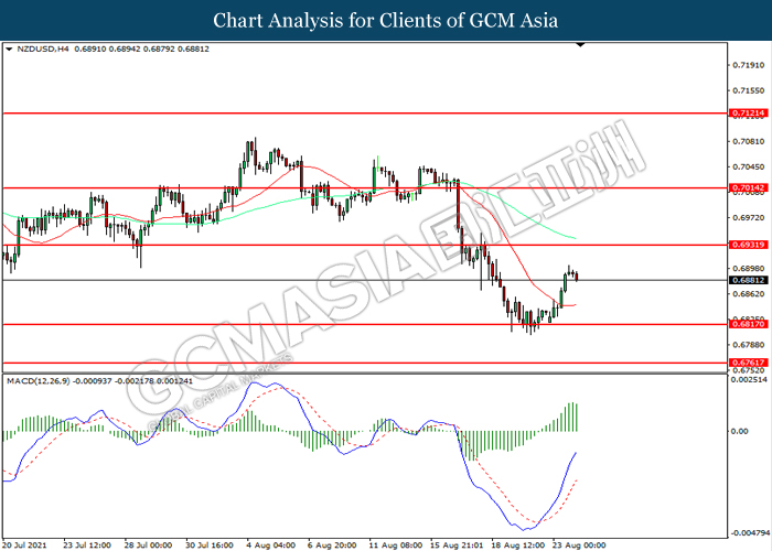NZDUSD, H4: NZDUSD was traded higher following prior rebound from the support level at 0.6815. MACD which illustrated increasing bullish momentum suggest the pair to extend its gains toward resistance level at 0.6930.