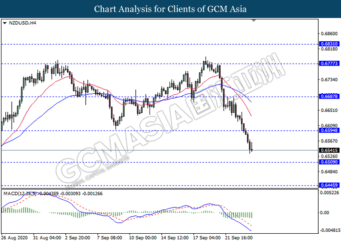 NZDUSD, H4: NZDUSD was traded lower following prior breakout below the previous support level 0.6595. MACD which display ongoing bearish momentum suggest the pair to extend its losses towards the support level 0.6510.