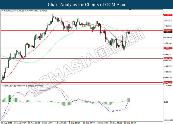 NZDUSD, H4: NZDUSD was traded higher while currently testing the resistance level at 0.7080. MACD which illustrated increasing bullish momentum suggest the pair to extend its gains after it successfully breakout above the resistance level.