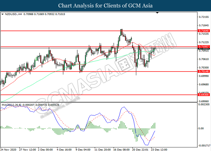 NZDUSD, H4: NZDUSD was traded higher while currently testing the resistance level at 0.7105. MACD which illustrated increasing bullish momentum suggest the pair to extend its gains after it successfully breakout above the resistance level.