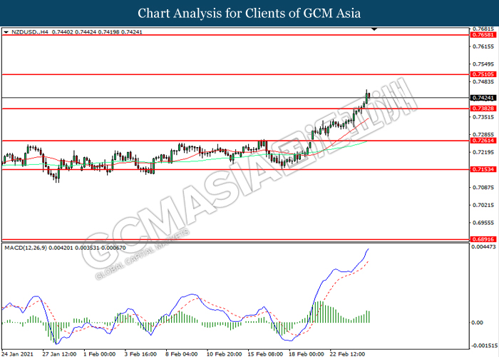 NZDUSD, H4: NZDUSD was traded higher following prior breakout above the previous resistance level at 0.7385. MACD which illustrated increasing bullish momentum suggest the pair to extend its gains toward resistance level at 0.7510.