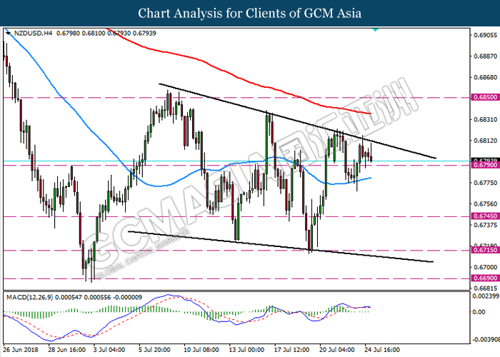 NZDUSD, H4: NZDUSD remain traded in a falling wedge channel following prior retracement from top of the channel and currently retest the support level 0.6790. Due to the lack of clear signal displayed from MACD, it is suggest for the pair to wait for further clear signal such as a breakout above the channel or below the support before entering the market.