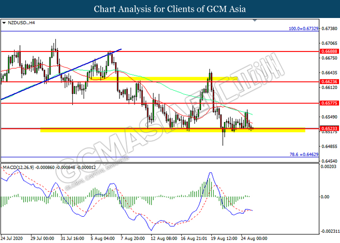 NZDUSD, H4: NZDUSD was traded lower while currently testing the support level at 0.6525. MACD which illustrated diminishing bullish momentum suggest the pair to extend its losses after it successfully breakout below the support level.