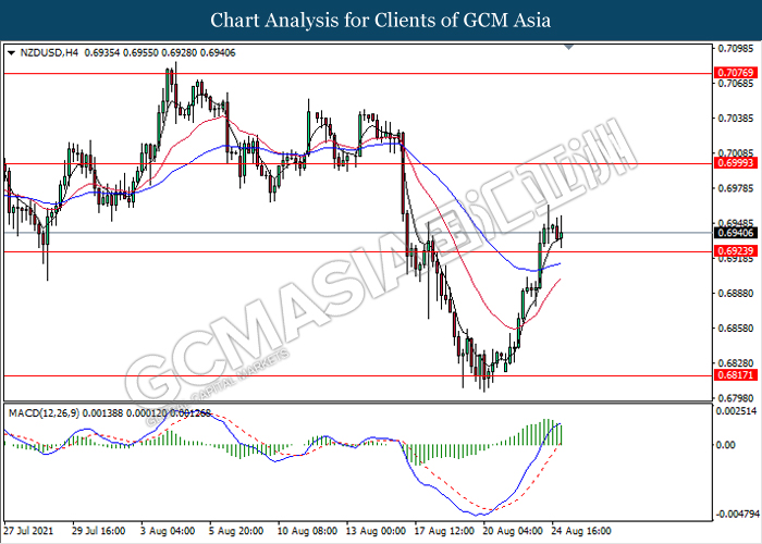 NZDUSD, H4: NZDUSD was traded lower while currently testing near the support level 0.6925. MACD which illustrate diminishing bullish momentum signal suggest the pair to extend its losses after it breaks below the support level 0.6925.