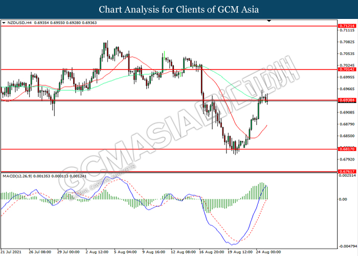 NZDUSD, H4: NZDUSD was traded higher following prior rebound from the support level at 0.6815. However, MACD which illustrated diminishing bullish momentum suggest the pair to be traded lower in short-term as technical correction.