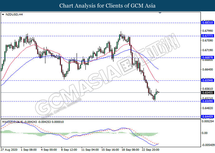 NZDUSD, H4: NZDUSD was traded higher following prior rebound from the support level 0.6510. MACD which display bullish bias signal with the starting formation of golden cross suggest the pair to extend its rebound towards the resistance level 0.6595.