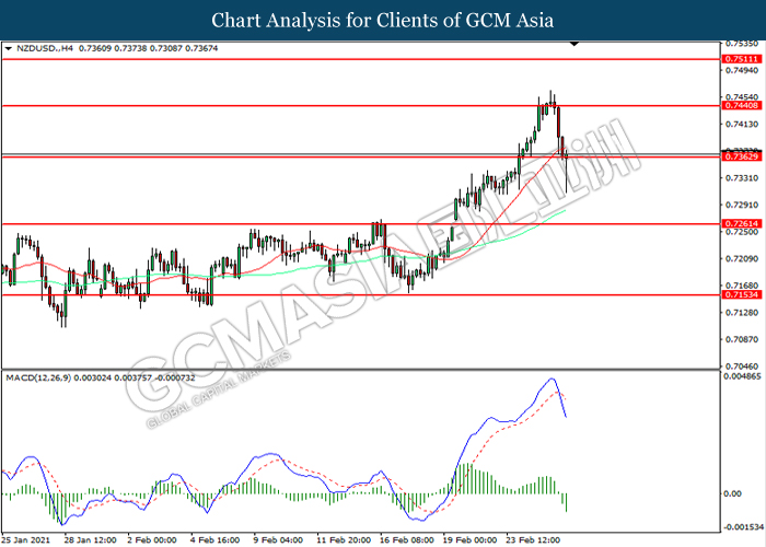 NZDUSD, H4: NZDUSD was traded lower while currently testing the support level at 0.7365. MACD which illustrated increasing bearish momentum suggest the pair to extend its losses after it successfully breakout below the support level.