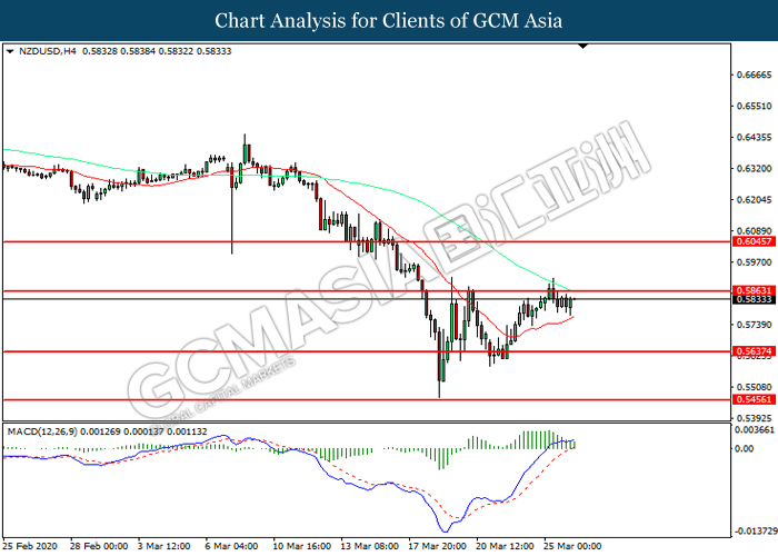 NZDUSD, H4: NZDUSD was higher while currently testing the resistance level at 0.5865. However, MACD which illustrated diminishing bullish momentum suggest the pair to be traded lower in short-term as technical correction.