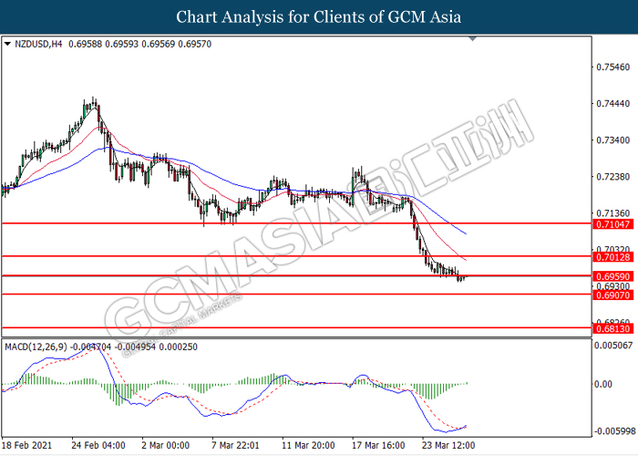 NZDUSD, H4: NZDUSD was traded flat near below the resistance level at 0.6960. MACD which illustrated bullish momentum signal suggests the pair to extend its gains after it successfully breakout above the resistance level.