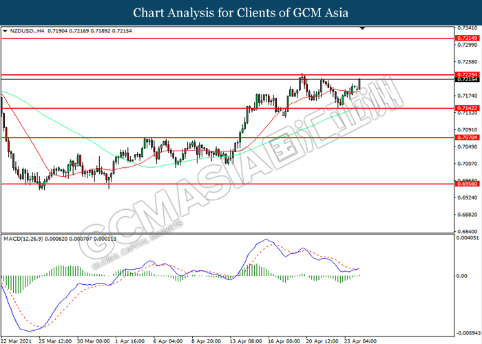 NZDUSD, H4: NZDUSD was traded higher while currently testing the resistance level at 0.7225. MACD which illustrated diminishing bearish momentum suggest the pair to extend its gains after it successfully breakout above the resistance level.