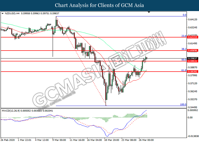 NZDUSD, H4: NZDUSD was traded higher following prior breakout above the previous resistance level at 0.6070. However, MACD which illustrated diminishing bullish momentum suggest the pair to be traded lower in short-term as technical correction.