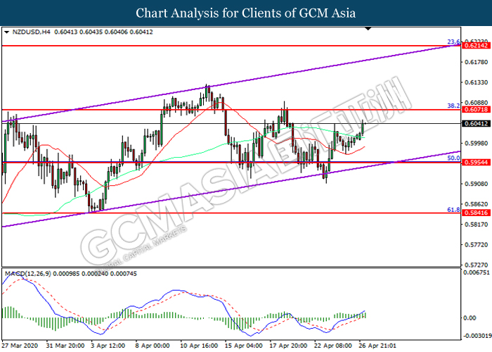 NZDUSD, H4: NZDUSD was traded higher while currently near the resistance level at 0.6070. MACD which illustrated increasing bullish momentum suggest the pair to extend its gains after it successfully breakout above the resistance level.
