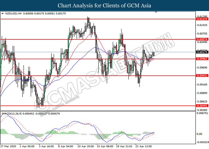 NZDUSD, H4: NZDUSD was traded higher following prior breakout above the previous resistance level at 0.5995. MACD which illustrate bullish bias momentum suggest the pair to extend its gains toward the resistance level at 0.6055.