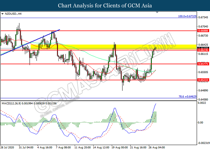 NZDUSD, H4: NZDUSD was traded higher following prior breakout above the previous resistance level at 0.6625. However, MACD which illustrated diminishing bullish momentum suggest the pair to be traded lower in short-term as technical correction.