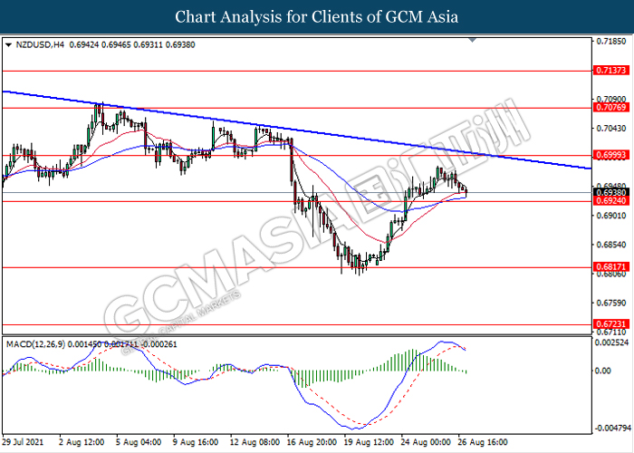 NZDUSD, H4: NZDUSD was traded lower while currently testing near the support level 0.6925. MACD which illustrate bearish bias signal with the formation of death cross suggest the pair to extend its losses after it breaks below the support level 0.6925.