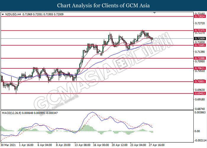 NZDUSD, H4: NZDUSD was traded lower following prior retracement from the resistance level at 0.7235. MACD which illustrated bearish bias momentum signal suggests the pair to extend its losses toward the support level at 0.7170.