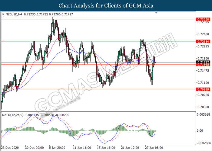 NZDUSD, H4: NZDUSD was traded higher following prior breakout above the previous resistance level at 0.7165. MACD which illustrated diminishing bearish momentum suggest the pair to extend its gains toward the resistance level at 0.7240.