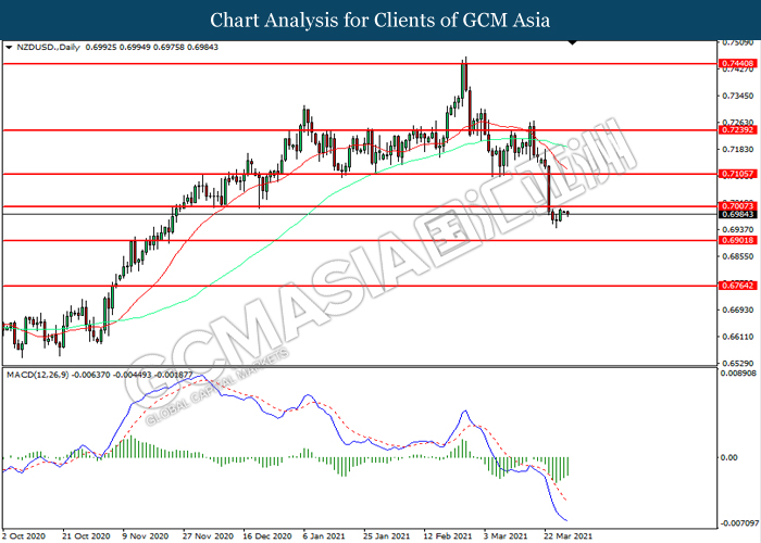 NZDUSD, Daily: NZDUSD was traded within a range while currently testing the resistance level at 0.7005. MACD which illustrated diminishing bearish momentum suggest the pair to be traded higher after it successfully breakout above the resistance level.