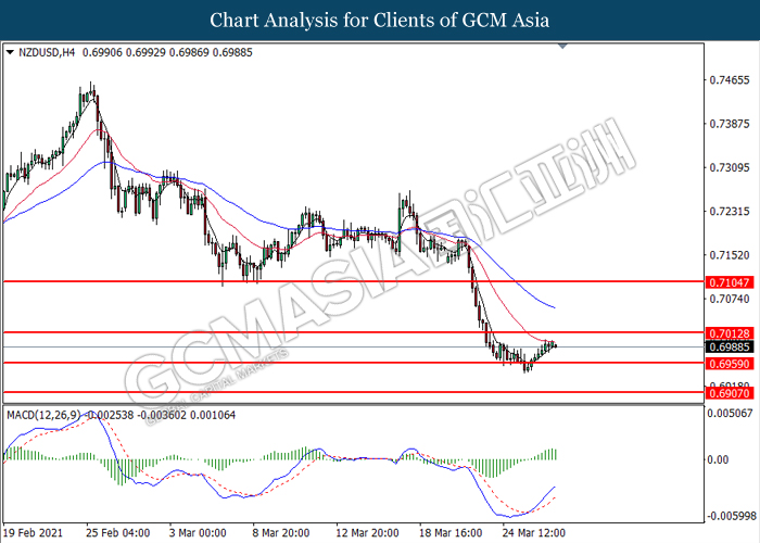 NZDUSD, H4: NZDUSD was traded higher following prior rebound from the support level at 0.6960. MACD which illustrated bullish momentum signal suggests the pair to extend its gains toward the resistance level at 0.7015.