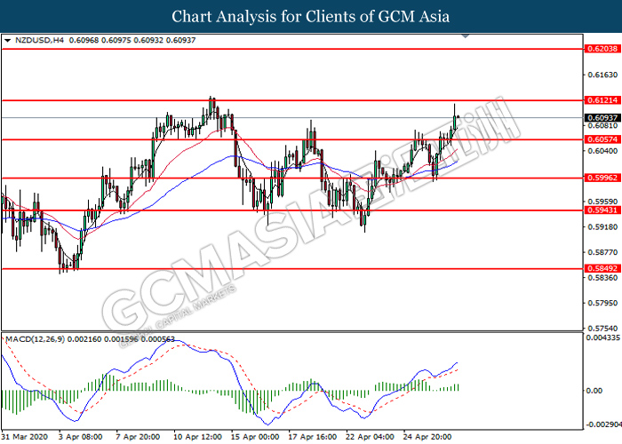 NZDUSD, H4: NZDUSD was traded higher following prior breakout above the previous resistance level at 0.6055. MACD which illustrate bullish bias momentum suggest the pair to extend its gains toward the resistance level at 0.6120.