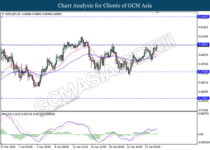 NZDUSD, H4: NZDUSD was traded higher while currently testing the resistance level 0.6085. MACD which illustrate bullish bias signal suggest the pair to extend its gains after it breaks above the resistance level.