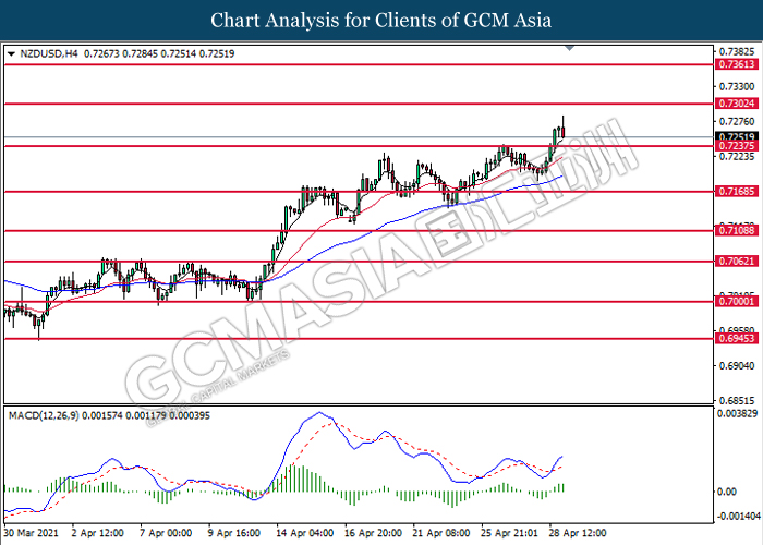 NZDUSD, H4: NZDUSD was traded lower following prior retracement from the higher level. MACD which illustrated diminishing bullish momentum signal suggests the pair to extend its losses toward the support level at 0.7235.