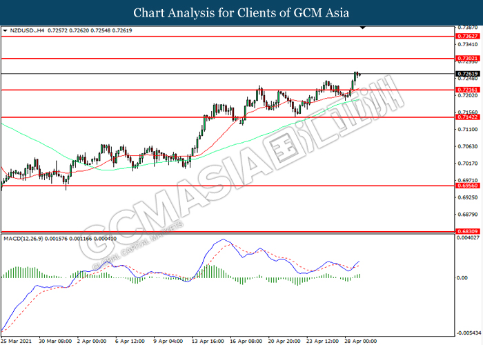 NZDUSD, H4: NZDUSD was traded higher following prior breakout above the previous resistance level at 0.7215. MACD which illustrated increasing bullish momentum suggest the pair to extend its gains toward resistance level at 0.7300.