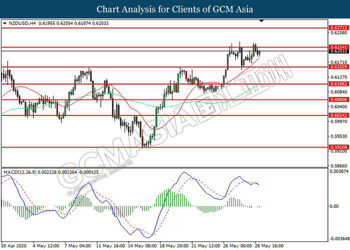 NZDUSD, H4: NZDUSD was traded lower following prior retracement from the resistance level at 0.6215. MACD which illustrated increasing bearish momentum suggest the pair to extend its losses toward support level at 0.6155.