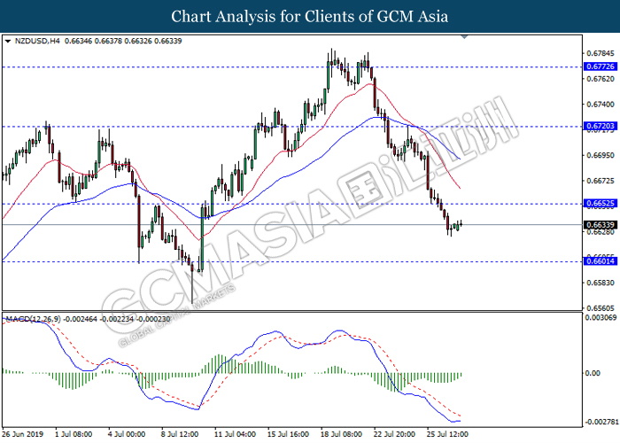 NZDUSD, H4: NZDUSD was traded lower following recent breakout below the previous support level 0.6650. However, MACD which illustrate diminishing bearish momentum suggest the pair to be traded higher as a short term technical correction towards the resistance level 0.6650.