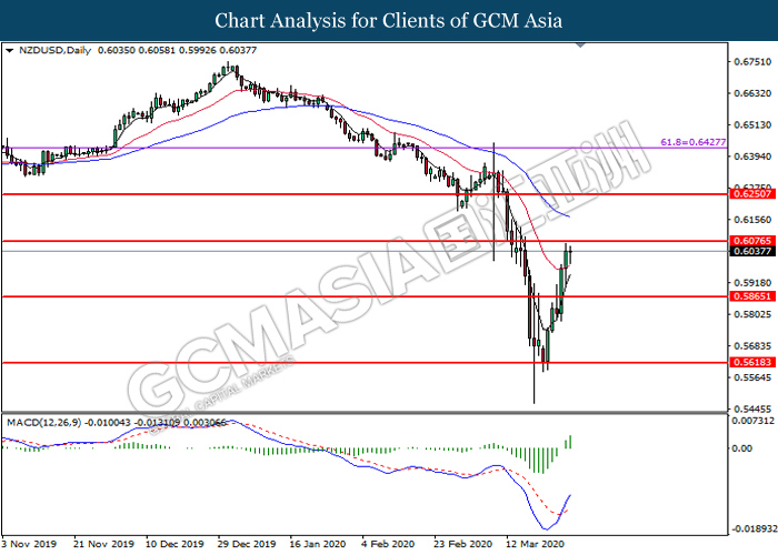 NZDUSD, Daily: NZDUSD was traded higher following prior breakout above the previous resistance level at 0.5865. MACD which illustrate bullish bias momentum suggest the pair to extend its gains toward the resistance level at 0.6075.
