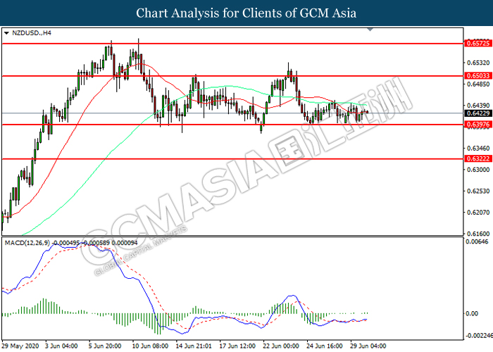 NZDUSD, H4: NZDUSD was traded lower while currently testing the support level at 0.6395. However, MACD which illustrated increasing bullish momentum suggest the pair to be traded higher in short-term as technical correction.