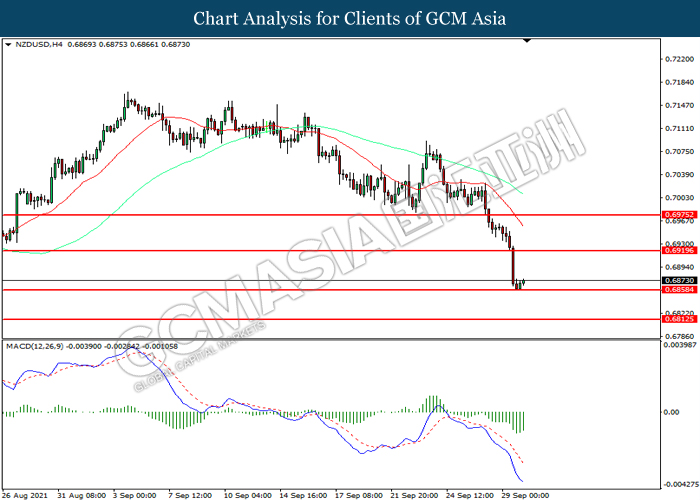 NZDUSD, H4: NZDUSD was traded lower while currently testing the support level at 0.6860. However, MACD which illustrated diminishing bearish momentum suggest the pair to be traded higher in short-term as technical correction.