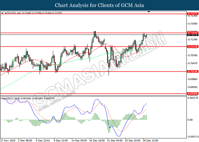 NZDUSD, H4: NZDUSD was traded higher while currently testing the resistance level at 0.7165. MACD which illustrated increasing bullish momentum suggest the pair to extend its gains after it successfully breakout above the resistance level.