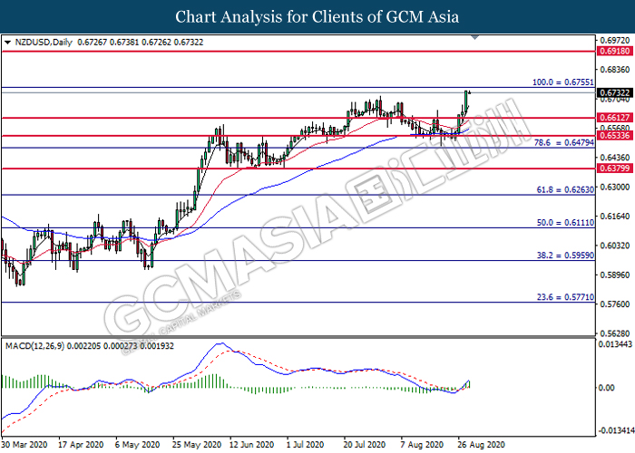 NZDUSD, Daily: NZDUSD was traded higher while currently testing the resistance level at 0.6755. MACD which illustrated bullish bias momentum suggest the pair to extend its gains after it successfully breakout above resistance level at 0.6755.