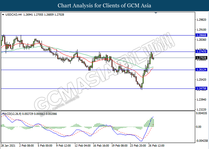 USDCAD, H4: USDCAD was traded lower following prior retracement from the resistance level 1.2745. MACD which illustrate diminishing bullish momentum signal suggest the pair to extend its retracement towards the support level 1.2610.