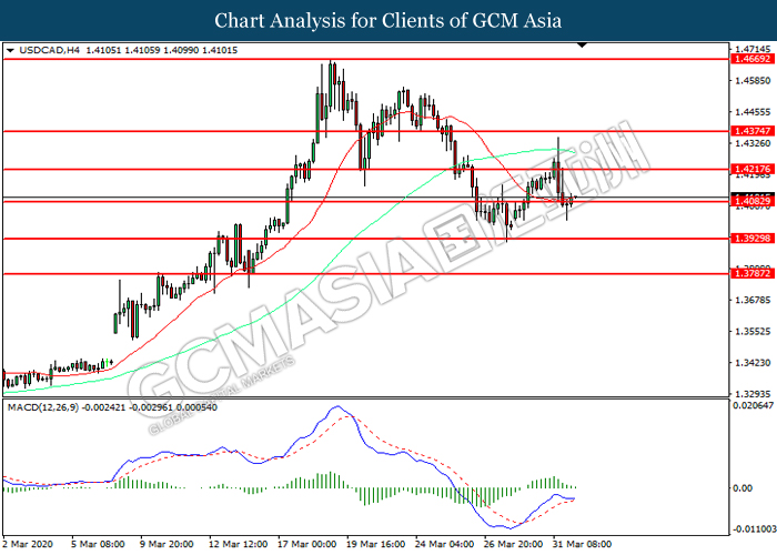 USDCAD, H4: USDCAD was traded lower while currently testing the support level at 1.4085. MACD which illustrated diminishing bullish momentum suggest the pair to extend its losses after it successfully breakout below the support level.