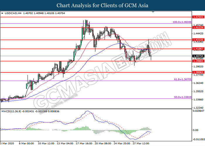 USDCAD, H4: USDCAD was traded lower following prior breakout below the previous support level at 1.4185. MACD which illustrate diminishing bullish momentum signal suggest the pair to extend its losses toward the support level at 1.3990.