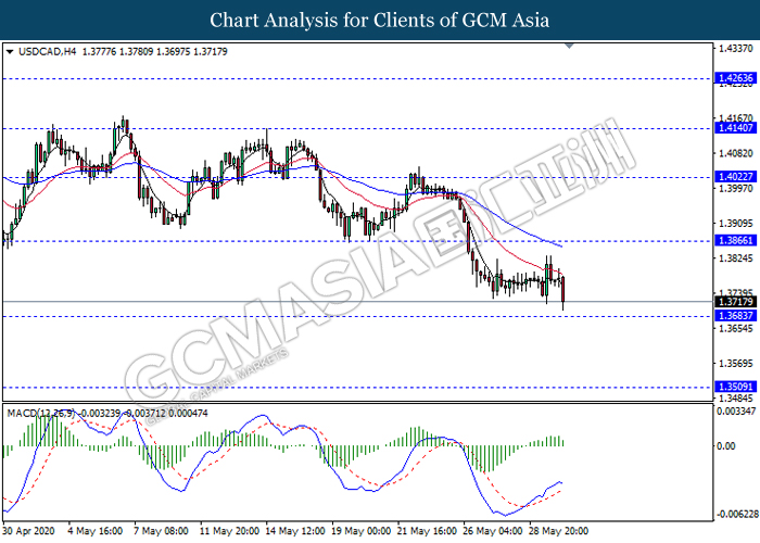 USDCAD, H4: USDCAD was traded lower while currently testing near the support level 1.3685. MACD which display diminishing bullish momentum signal suggest the pair to extend its losses after it breaks below the support level.