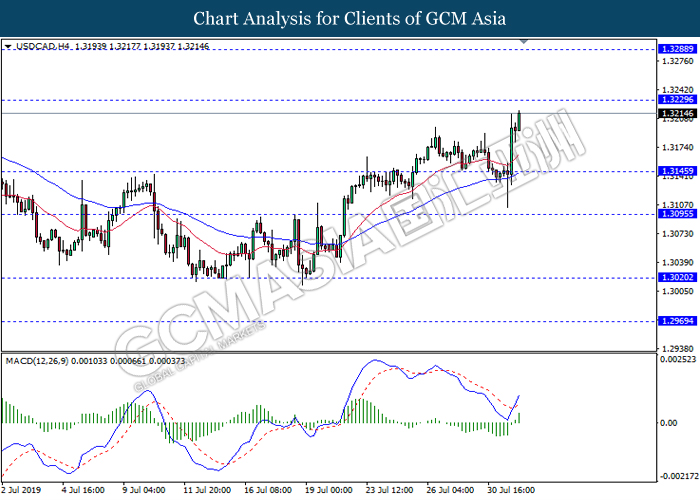 USDCAD, H4: USDCAD was traded higher while currently testing near the resistance level 1.3230. MACD which display bullish momentum signal with the formation of golden cross suggest the pair to extend its gains after it breaks above the resistance level.
