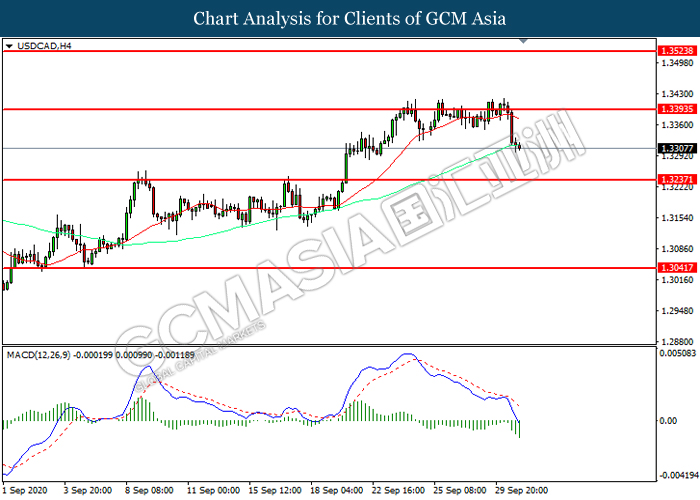 USDCAD, H4: USDCAD was traded lower following prior retracement from the resistance level at 1.3395. MACD which illustrated increasing bearish momentum suggest the pair to extend its losses toward support level at 1.3235.