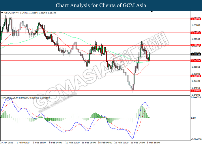 USDCAD, H4: USDCAD was traded lower while currently testing the support level at 1.2640. MACD which illustrated diminishing bullish momentum suggest the pair to extend its losses after it successfully breakout below the support level.
