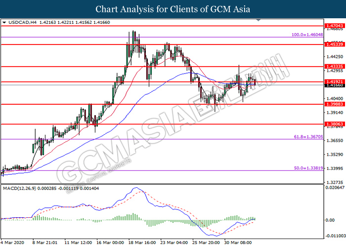 USDCAD, H4: USDCAD was traded lower while currently testing the support level at 1.4190. MACD which illustrate diminishing bullish momentum signal suggest the pair to extend its losses after it successfully breakout below the support level at 1.4190.