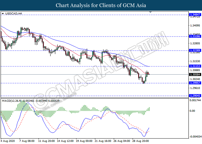 USDCAD, H4: USDCAD was traded higher following prior rebound from the support level 1.2995. However, MACD which illustrate bullish momentum signal with the formation of golden cross suggest the pair to extend its rebound towards the resistance level 1.3115.