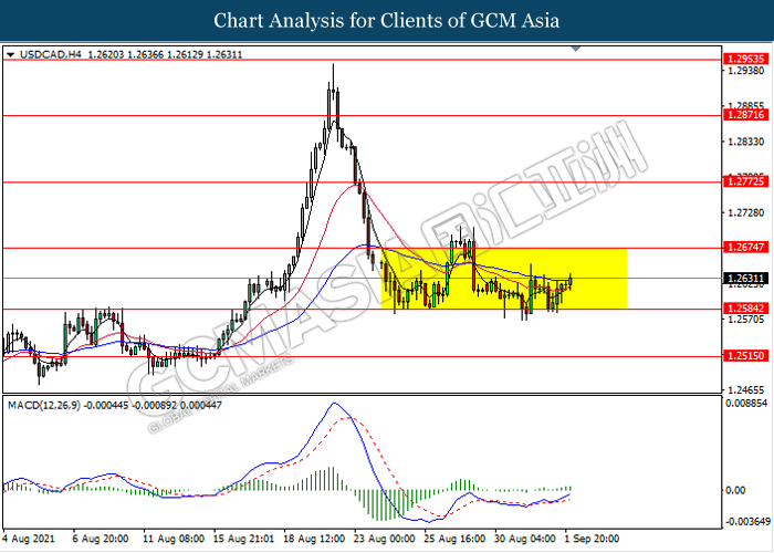 USDCAD, H4: USDCAD remain traded in a sideway channel following recent rebound form the support level 1.2585. However, MACD which illustrate bullish momentum signal with the formation of golden cross suggest the pair to extend its rebound towards the resistance level 1.2675.