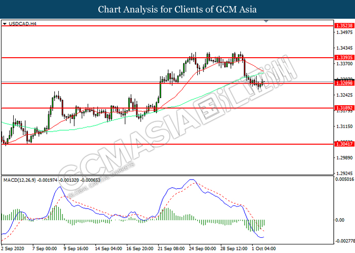 USDCAD, H4: USDCAD was traded lower while currently testing the support level at 1.3290. However, MACD which illustrated diminishing bearish momentum suggest the pair to be traded higher in short-term as technical correction.
