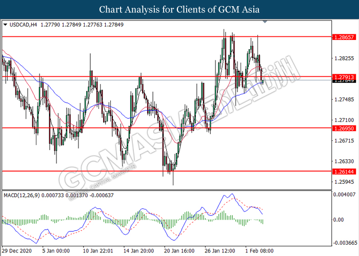 USDCAD, H4: USDCAD was traded lower following prior breakout below the previous support level at 1.2790. MACD which illustrate bearish bias momentum signal suggest the pair to extend its losses toward the support level at 1.2695.