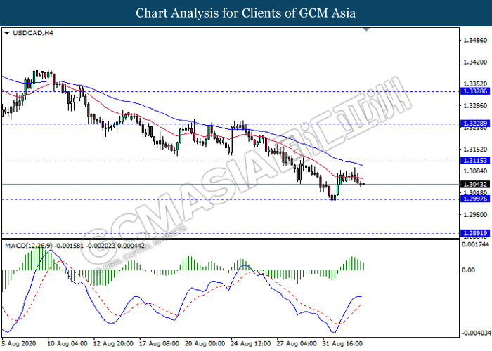 USDCAD, H4: USDCAD was traded lower following prior retracement from the MA lines. MACD which illustrate diminishing bullish bias signal suggest the pair to extend its retracement in short term towards the support level 1.2995.